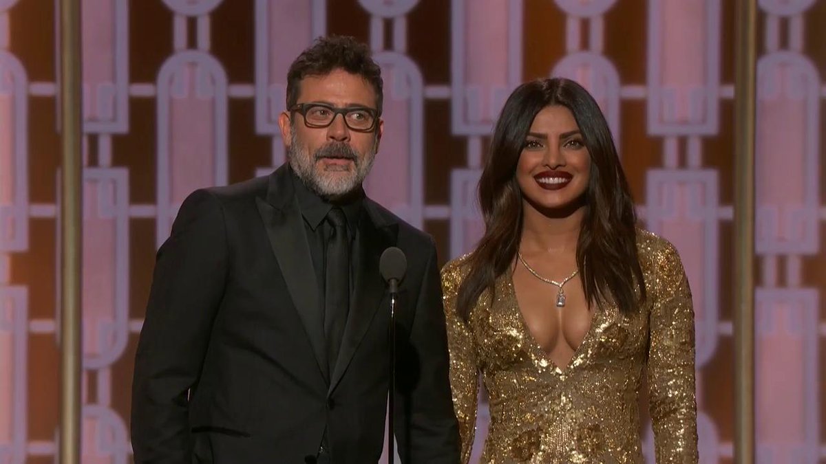 Dressed in a shimmer golden gown by Ralph Lauren, Priyanka looked drop dead gorgeous as she shared a hearty laugh backstage with Jeffery Dean Morgan.